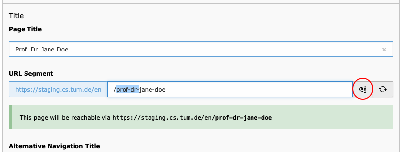 To edit the URL Segment, click on the eye/chain symbol to the right of the input field to unlock its value. If the field consists of a long string of characters and numbers, press the reload button to the right first.