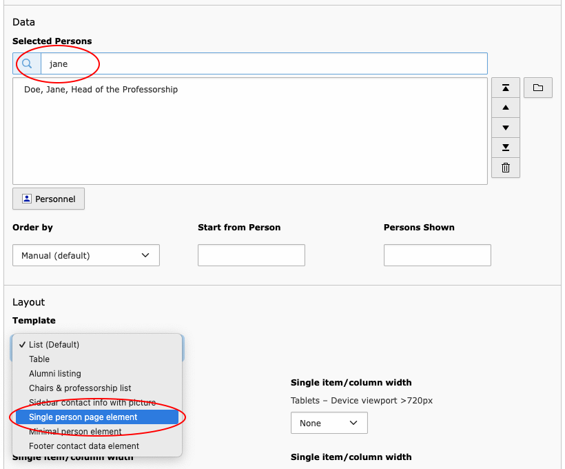 Be sure to change the Template to Single person page element. You may further customize what dataset you want to display with the fields below in the form.