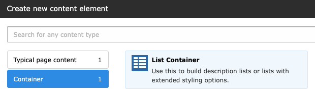 Click on the + Create content Element button in the List Container you just added. There will only be one Content Element option to choose from – List Container Element.