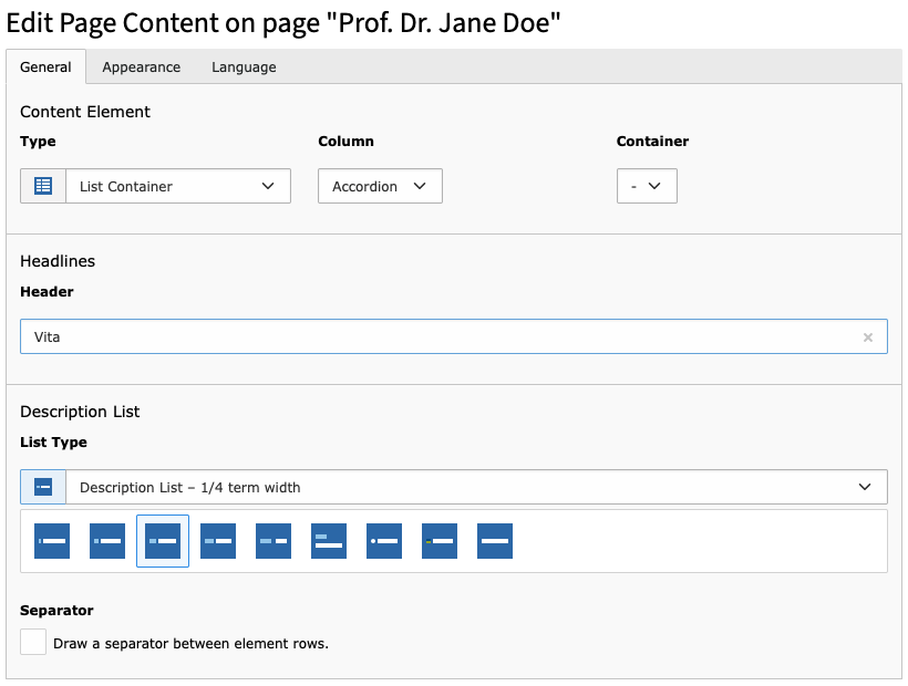 - Accordion: Elements put here will automatically be rendered as an accordion. Only Text and List Container Content Elements are allowed.
