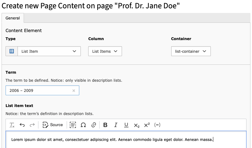 In case of a curriculum vitae, fill in the time span in the Term field. Then enter the occupation in the List item text field.